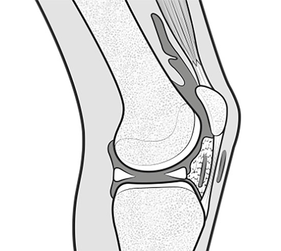 Questa condizione clinica può poi evolvere in atrofia muscolare, accorciamento del tendine rotuleo e cicatrizzazione localizzata o generalizzata all'interno e all'esterno dell'articolazione del ginocchio, coinvolgendo quindi l'intera capsula articolare che si ispessisce.